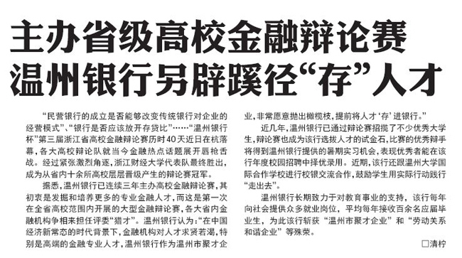 201568日,温州晚报刊发主办省级高校金融辩论赛 温州银行另辟蹊径‘存’人才